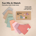 Available in more than 10 designs, the spit ups bibs come in unisex, gender neutral designs or baby boy bibs design and baby girl bibs design. Sold in a 8 pack and comes with a sustainable kraft gift box.