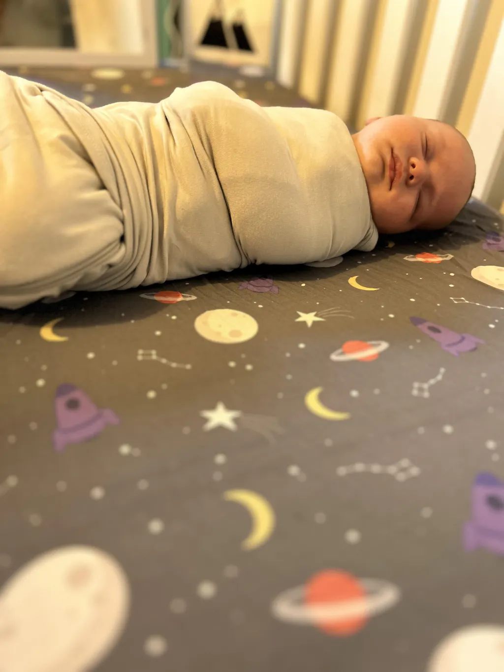 - Fully removable swaddle wrap attached to the sleep bag via Velcro, which allows for different positioning of the swaddle as baby grows.