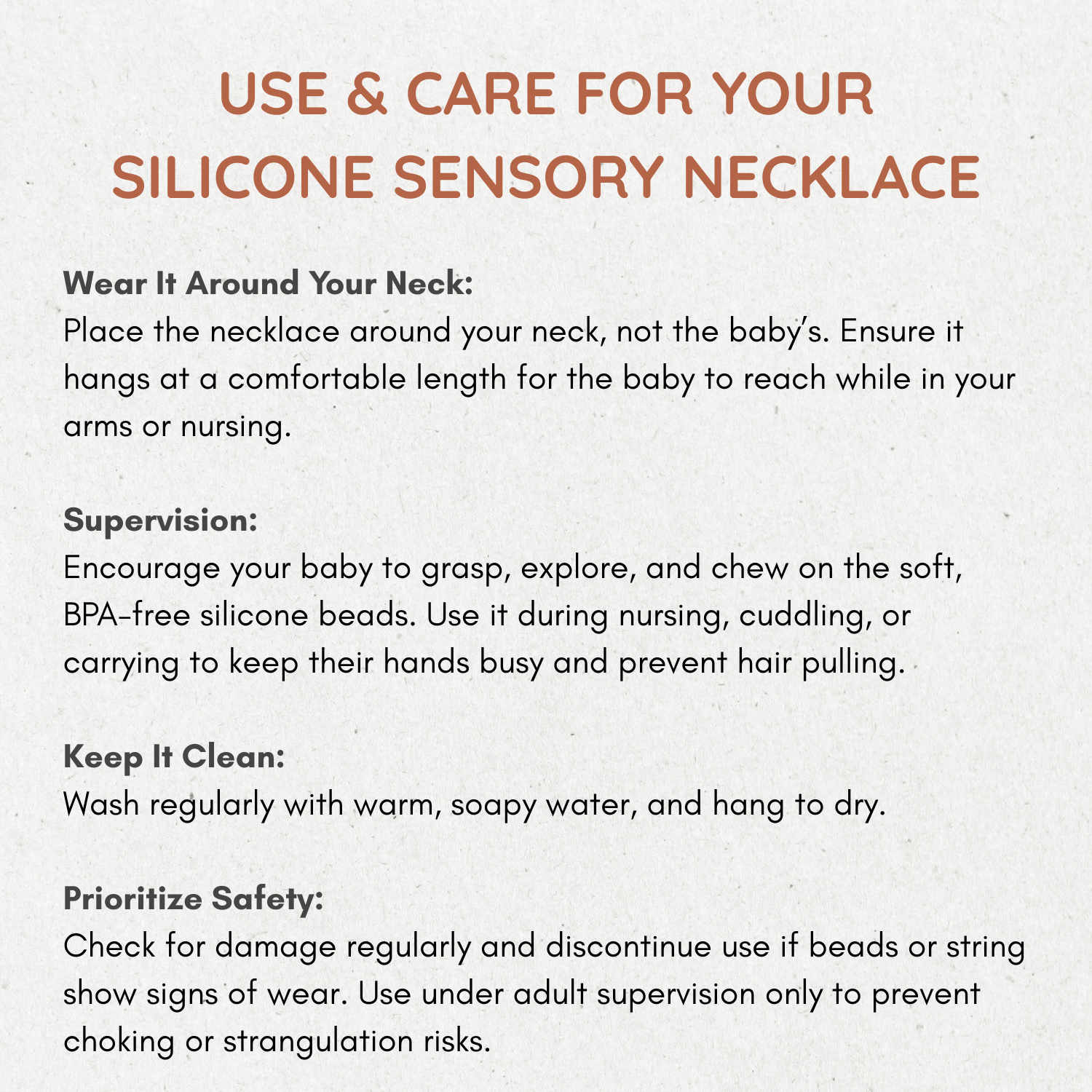 Introduce your little one to a world of exploration with our Silicone Sensory Necklace that is safe and fun for babies to play with and chew! Our silicone accessories are designed to stimulate their senses and support early development. Crafted from baby-safe, non-toxic food-grade silicone, these toys encourage tactile and visual engagement, helping infants discover textures, sounds, and colours while developing essential motor skills.